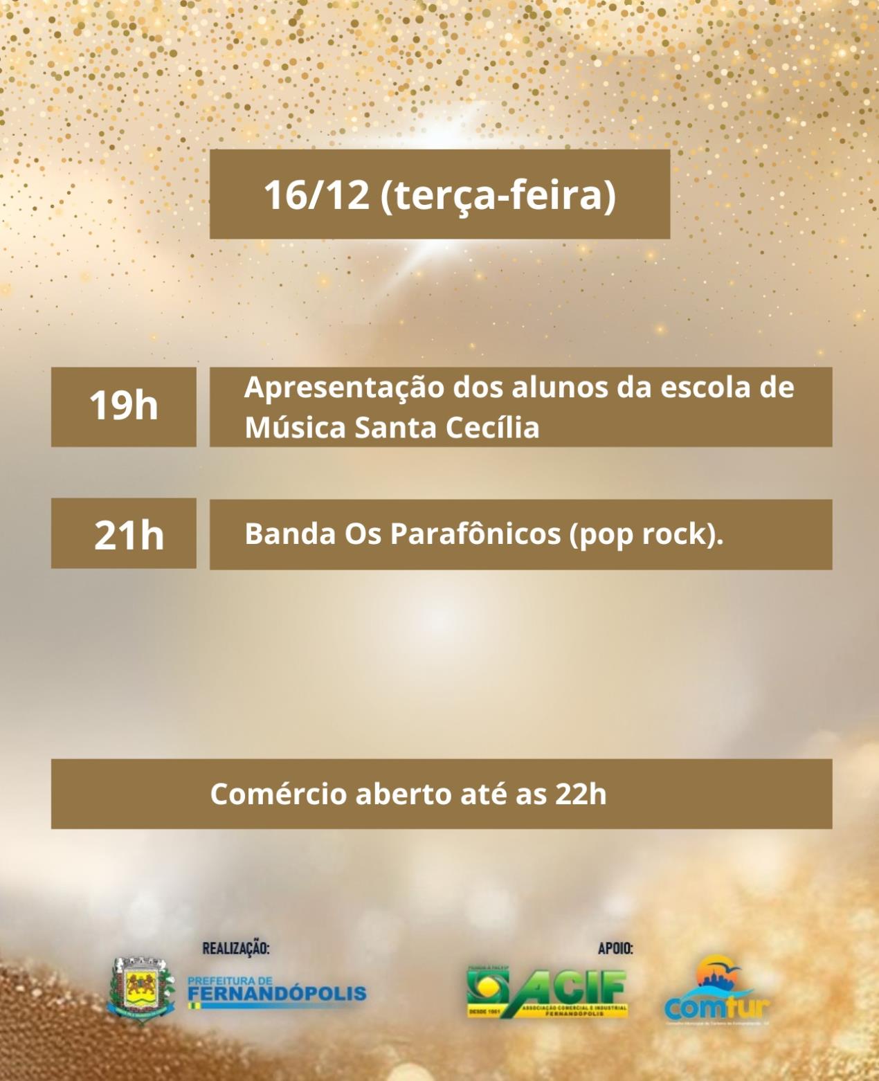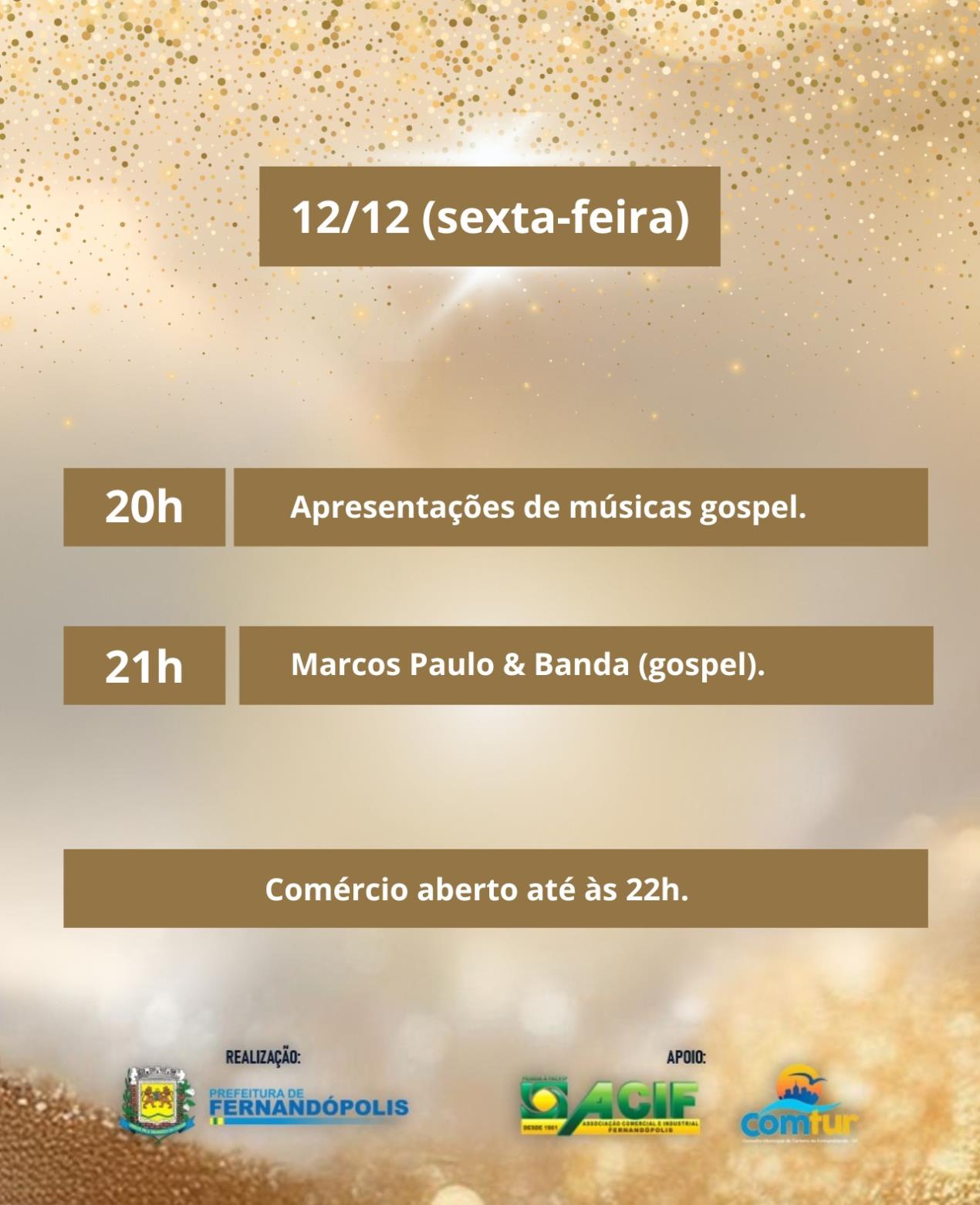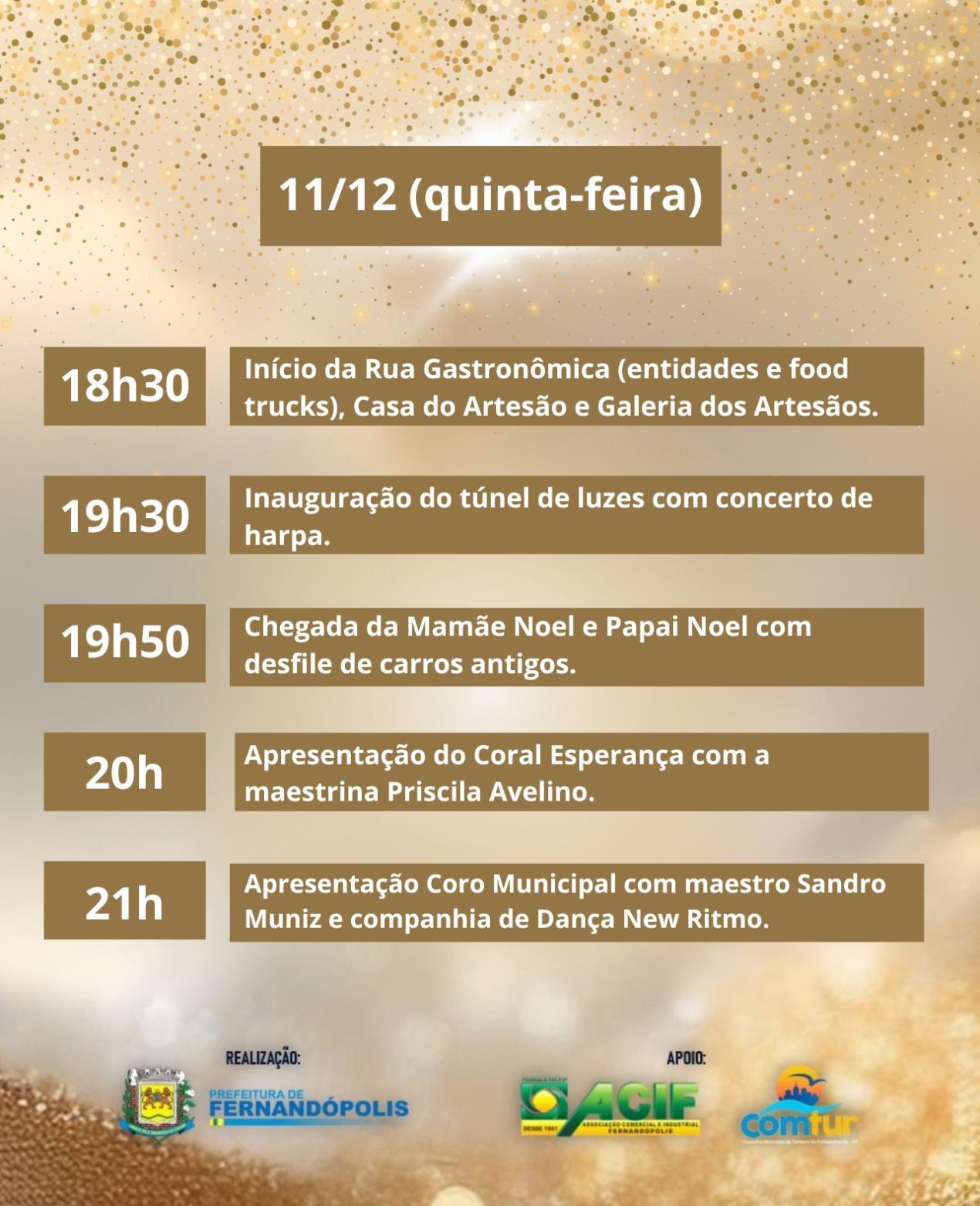 Logo no início da noite será aceso o Túnel de Luzes na Rua São Paulo, criado em parceria com a ACIF. Com mais de 50 mil pontos de luz, o espaço será um dos principais locais para fotos e encontros durante o evento.