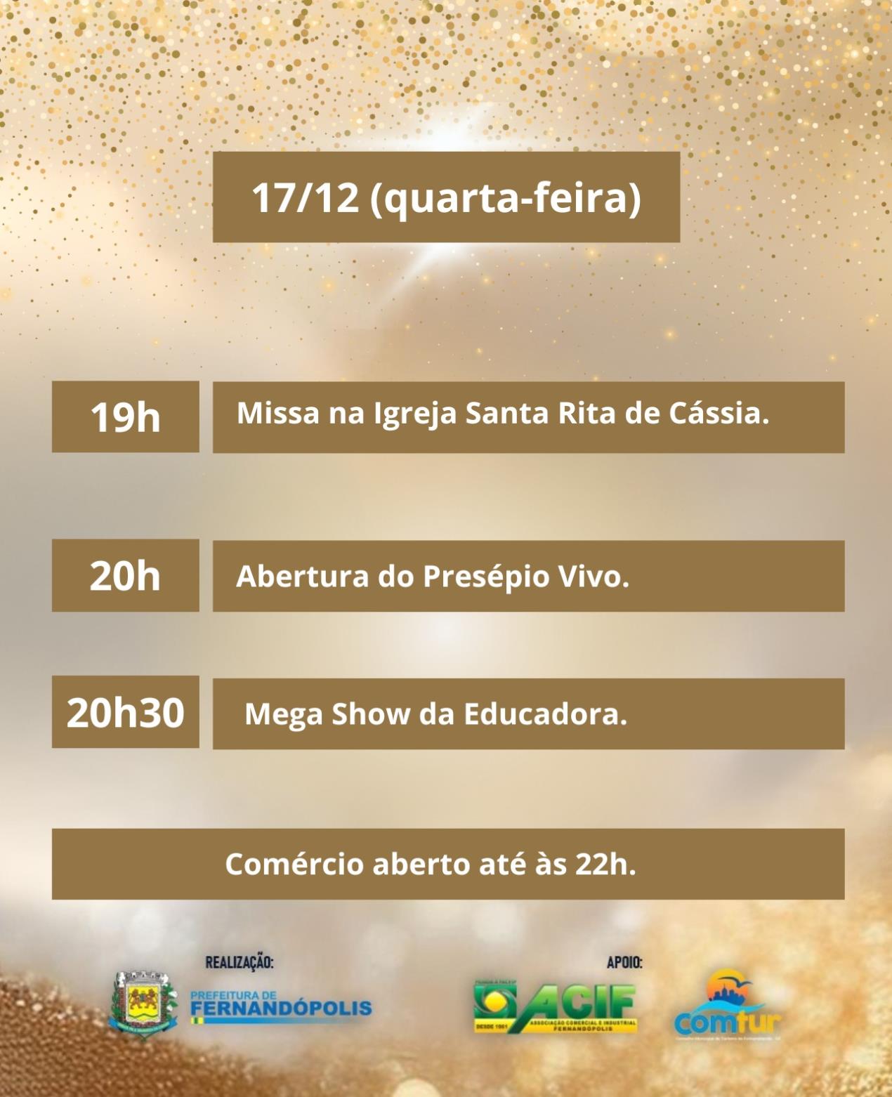 20h30: Mega Show da Educadora com Brady Willian, Caio Marques, Sofia Brasil, Banana Split, Brenda Jóia, Fabrício Renno, Dani & Danilo, Tradição, Victor & Franco, Thomas & Pierre, Divino & Donizete, Léo & Júnior, Jayne, Ricardo & João Fernando, Junior Marques, João Villa & Rafael e Oba Oba Samba House.