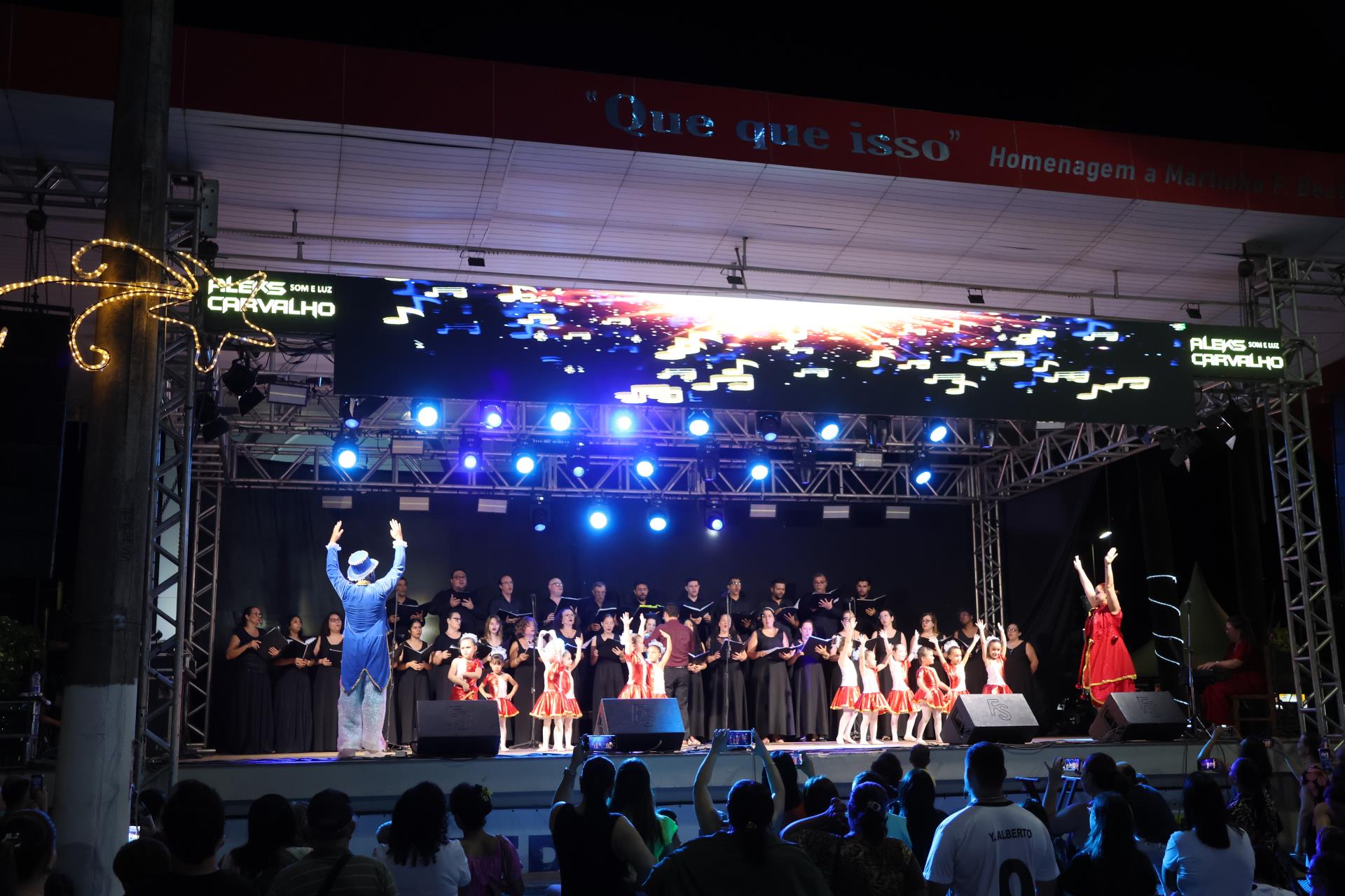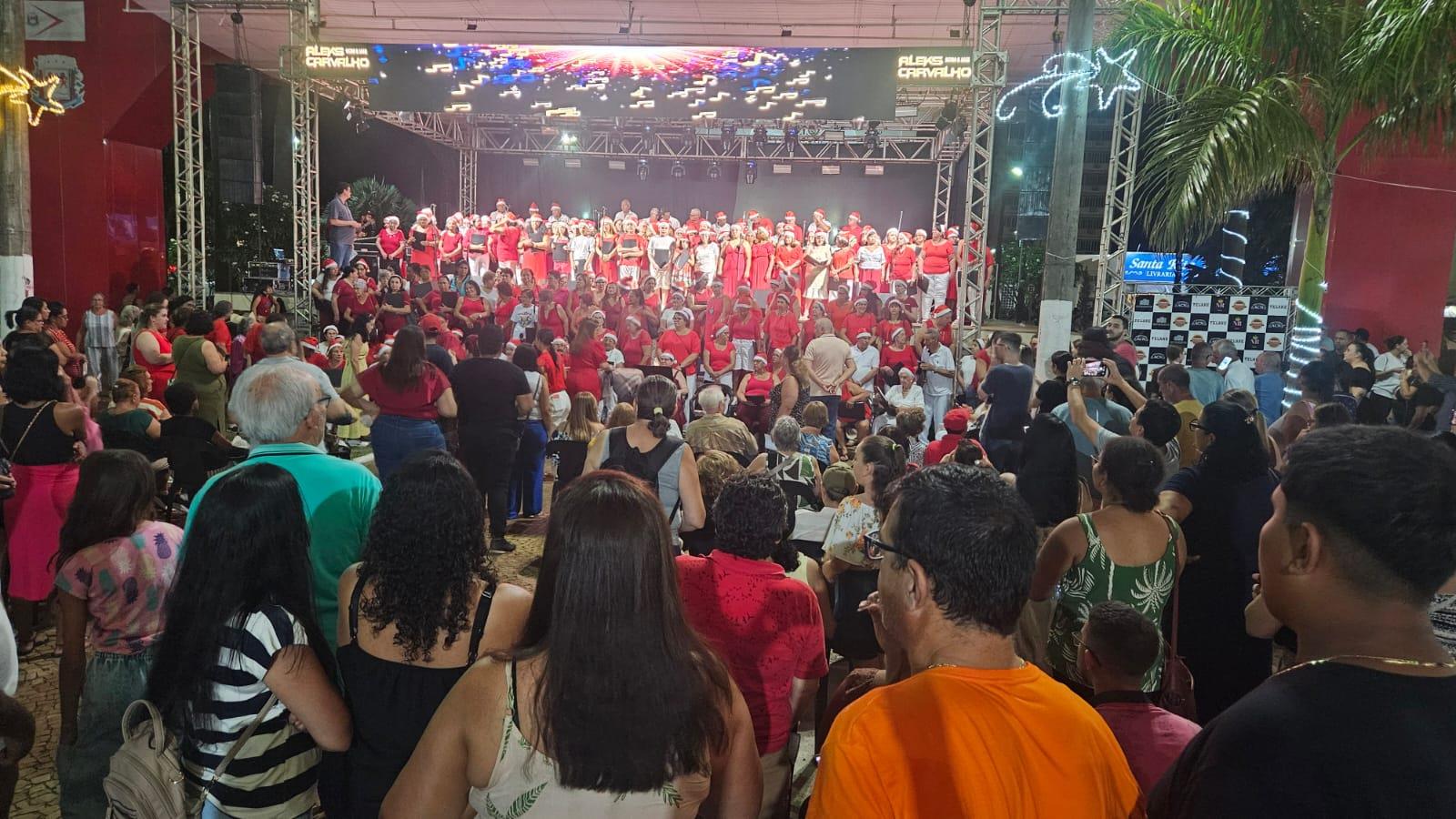 Na sequência, o Coral Esperança, sob regência da maestrina Priscila Avelino, encantou o público com cerca de 200 vozes interpretando clássicos natalinos. Para encerrar a noite, o Coro Municipal, conduzido pelo maestro Sandro Muniz, realizou uma apresentação especial ao lado da companhia de dança New Ritmo.