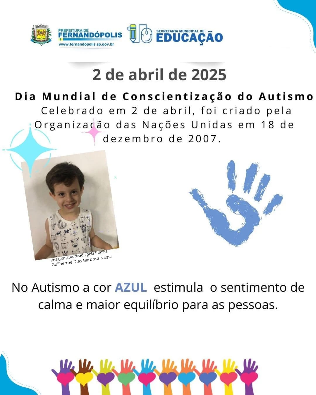 No autismo, a cor azul estimula o sentimento de calma e maior equilíbrio para as pessoas. Diante disso, a Secretaria Municipal de Educação de Fernandópolis promove nesta quarta-feira o “Vista Azul”, campanha à qual aderiram muitos funcionários de outros setores da administração municipal.
