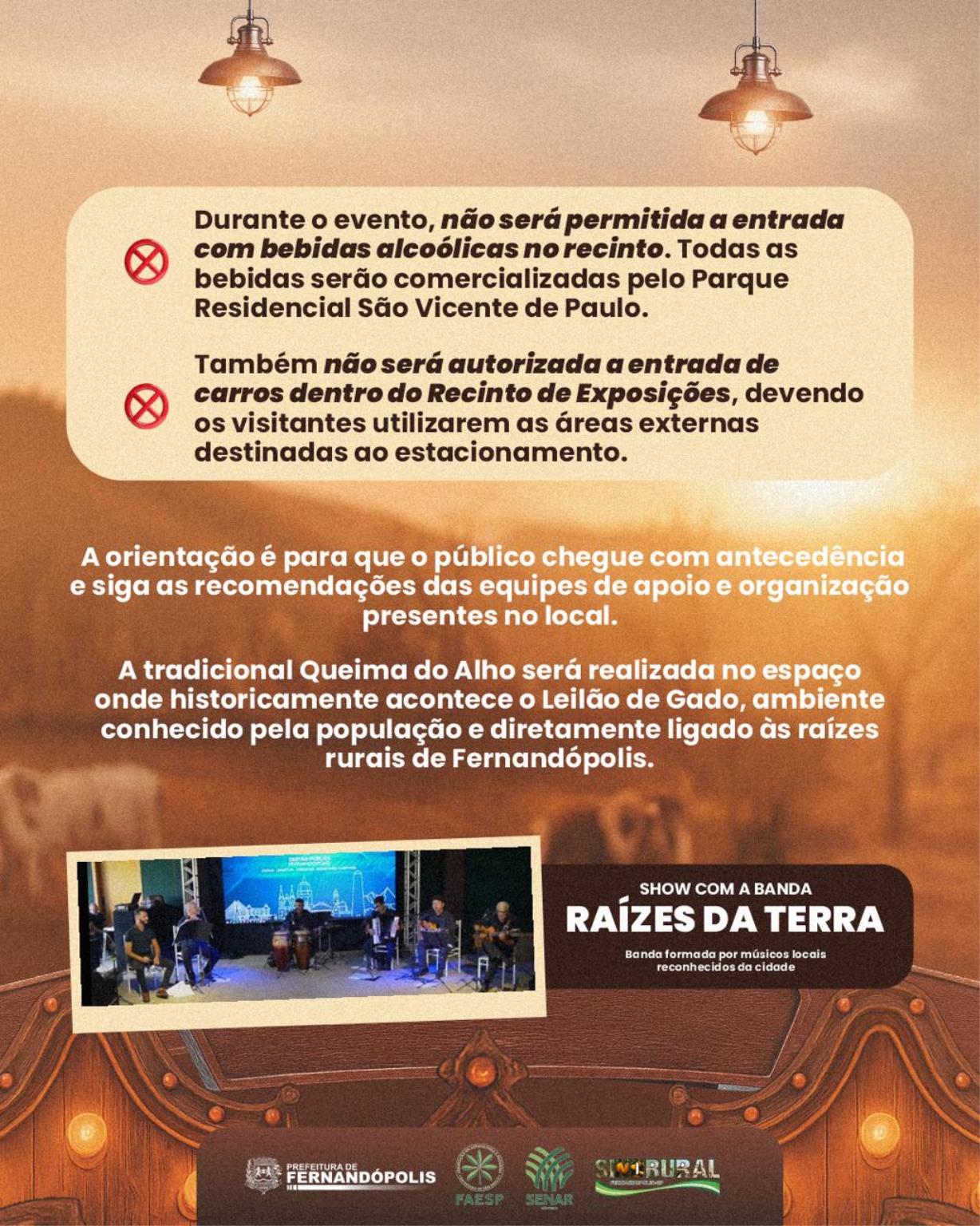 Não será permitida a entrada com bebidas alcoólicas no recinto. A recomendação é que o público chegue com antecedência e siga as orientações das equipes de apoio.