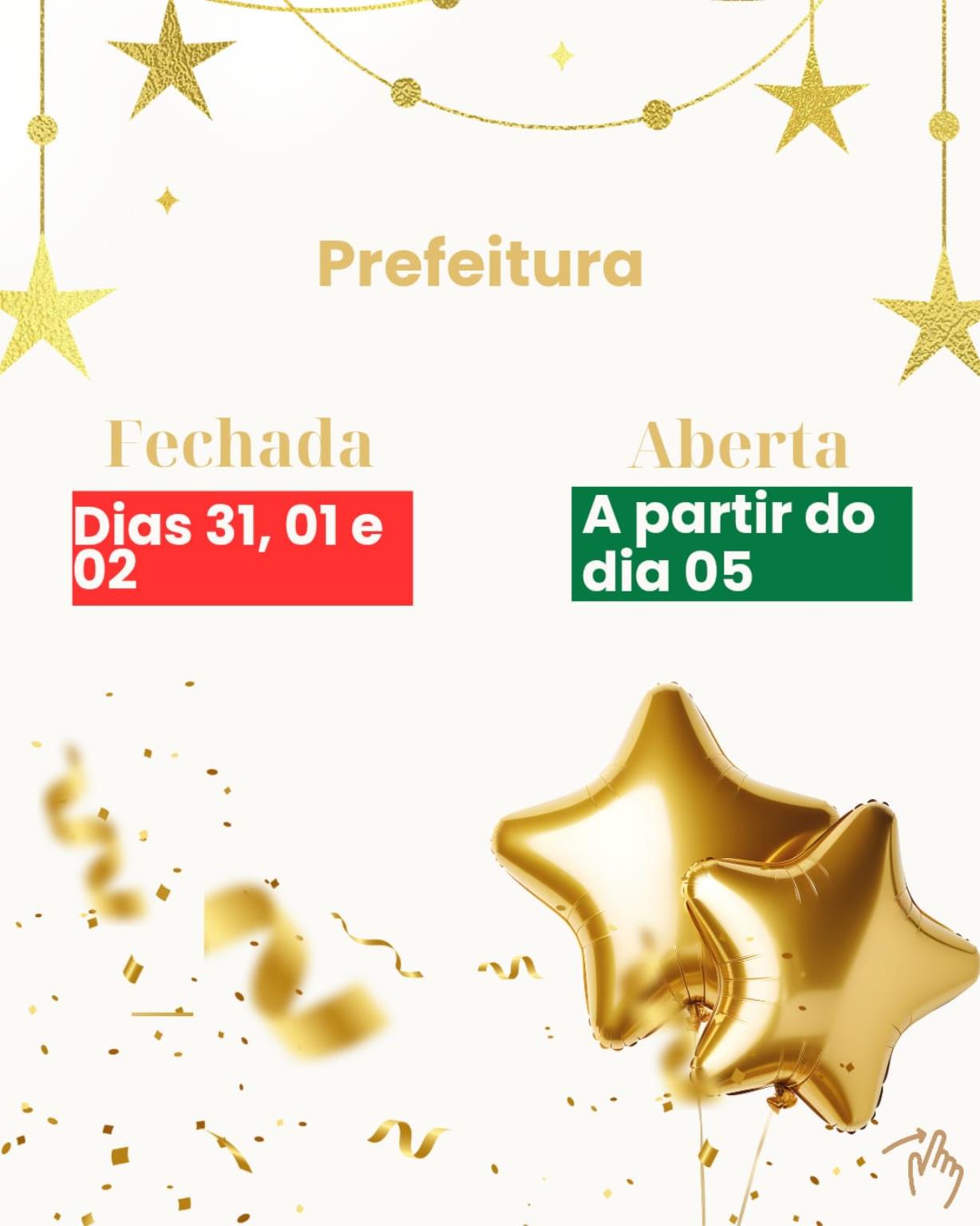Com as Festas de Passagem do Ano – Réveillon o prédio da prefeitura estará sem expediente nos dias 31/12, 01/01 e 02/01 Os serviços básicos da municipalidade funcionam em horários especiais. Saiba como ficam os expedientes de algumas repartições públicas: