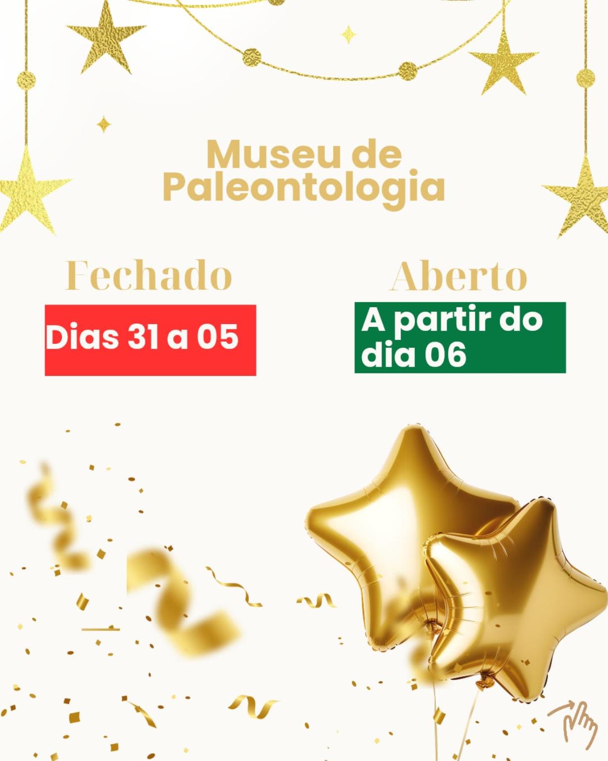 MUSEU DE PALEONTOLOGIA – Estará fechado nos dias 31/12 a 05/01. Retornando no dia 06/01 das 8 às 17 horas.