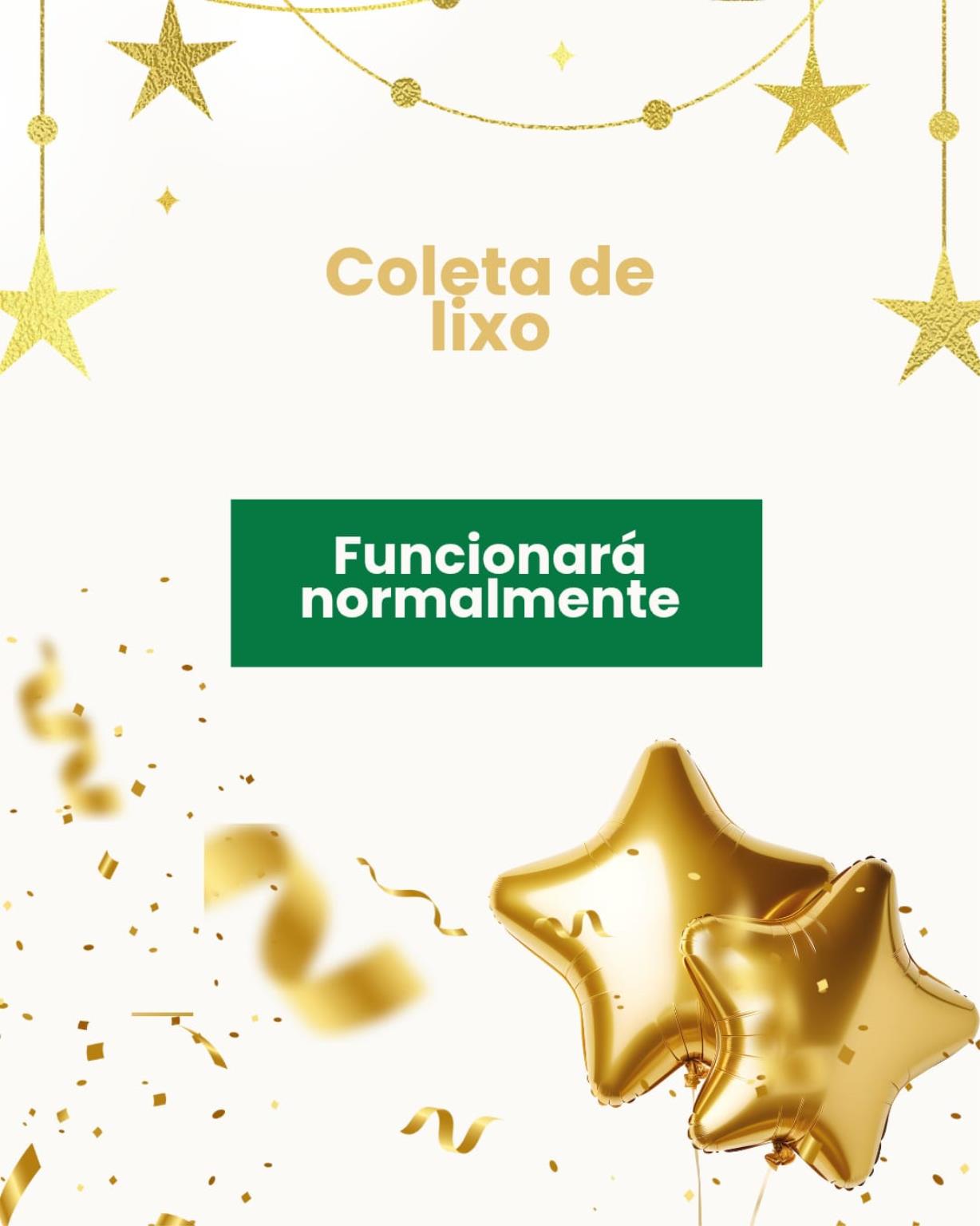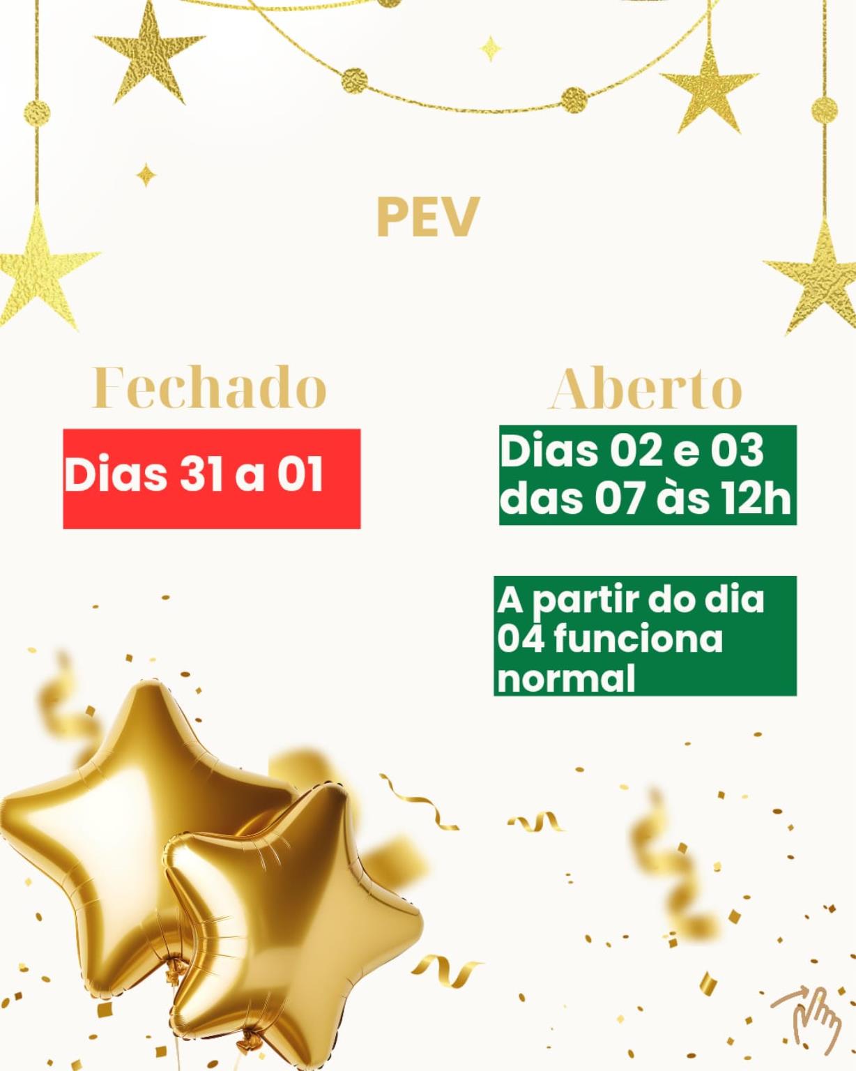 PONTO DE ENTREGA VOLUNTÁRIA (PEV) – Fechado dia 31/12 e 01/01. Funciona dia 02/01 e 03/01 das 7 às 12 h e no dia 04/01 o dia todo.
