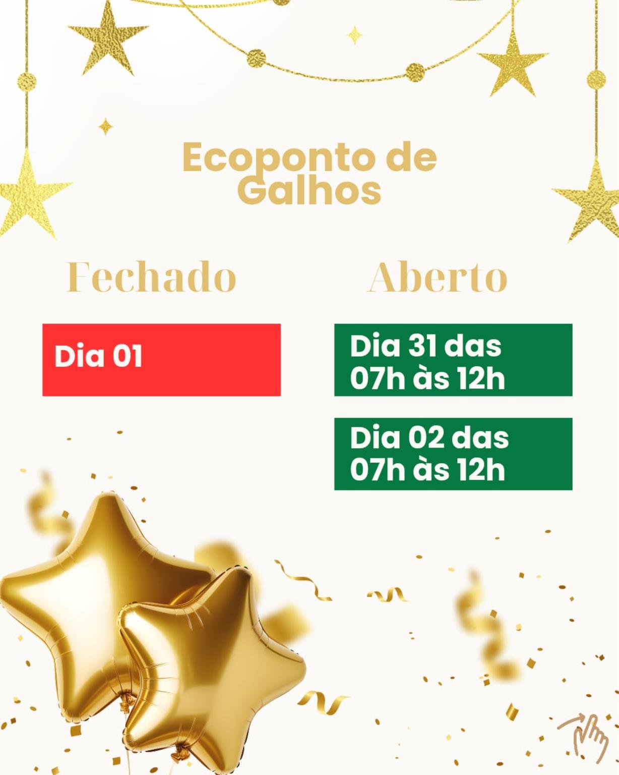ECOPONTO DE GALHOS – Funciona dia 31/12 das 7 às 12h. Dia 01/01 estará fechado e retorna dia 02/01 das 7 às12h normalmente.