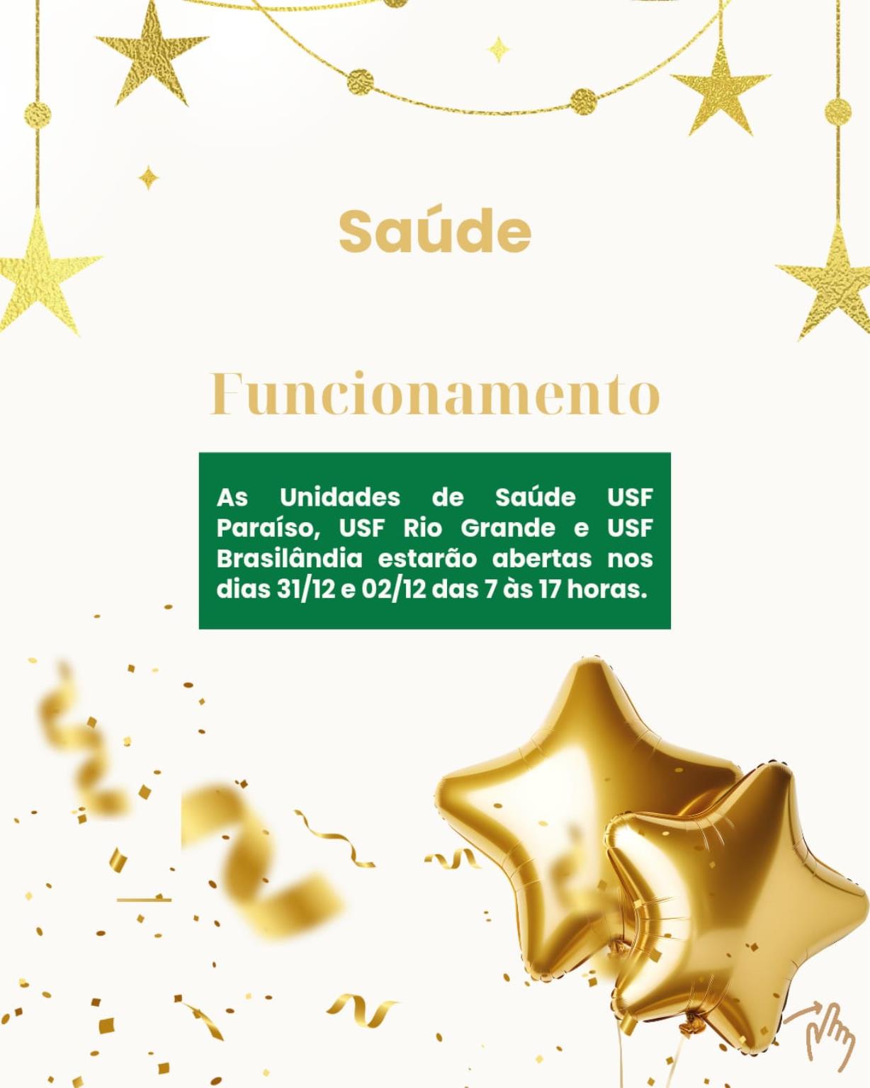 SAÚDE – As Unidades de Saúde USF Paraíso, USF Rio Grande e USF Brasilândia estarão abertas nos dias 31/12 e 02/12 das 7 às 17 horas.