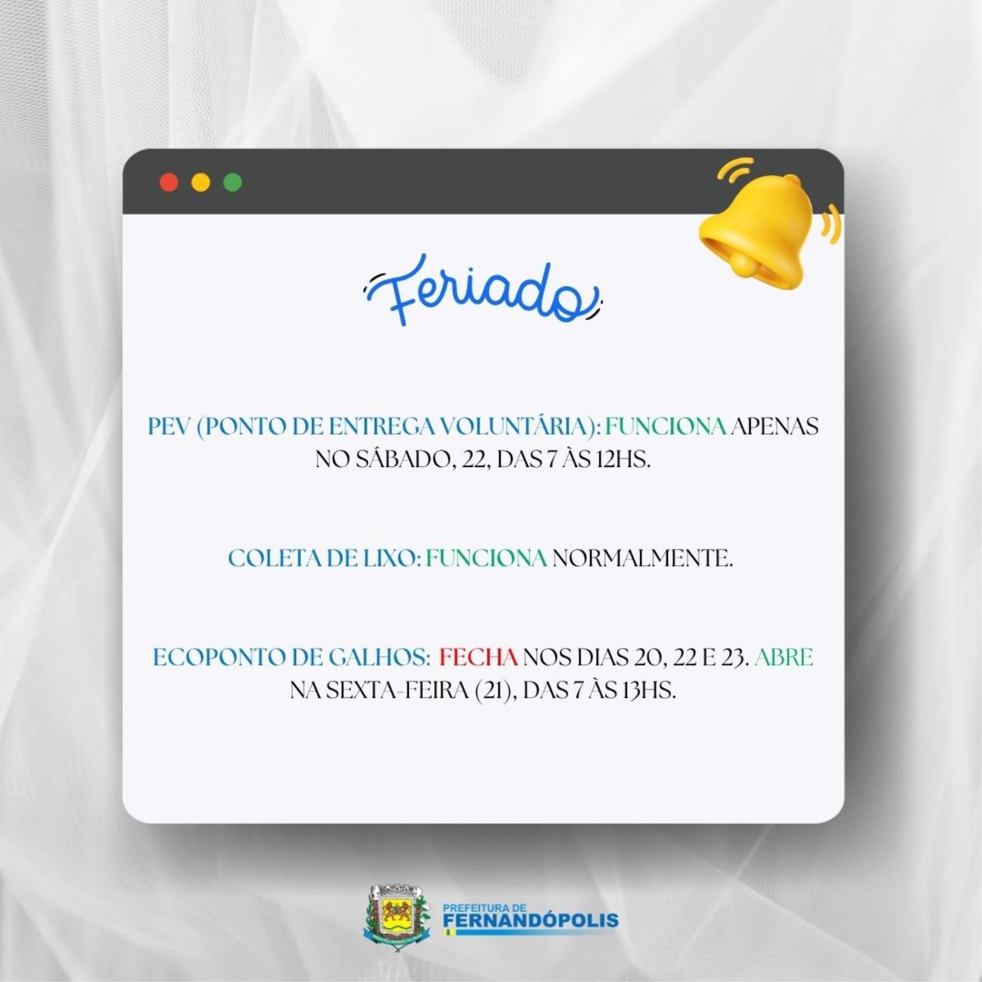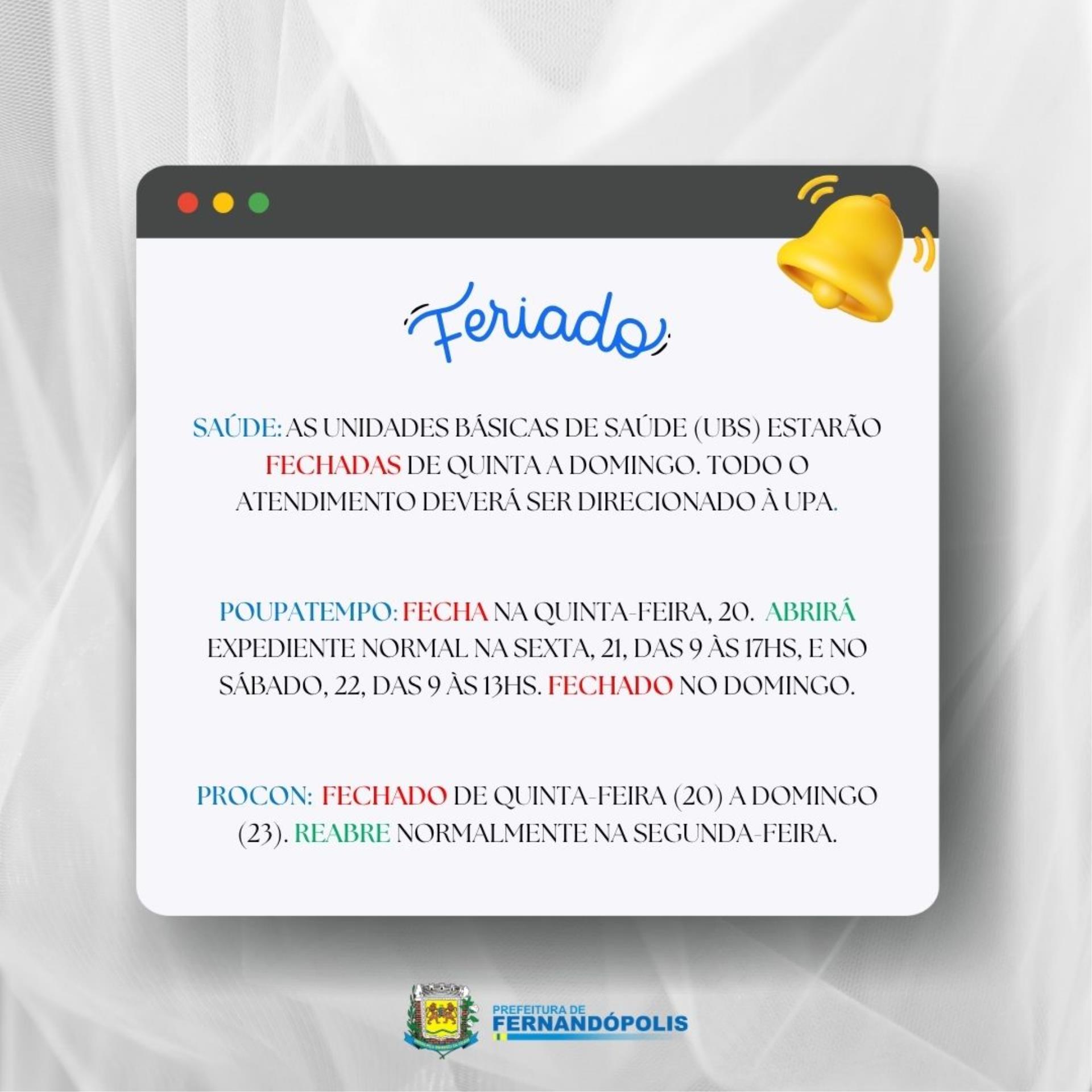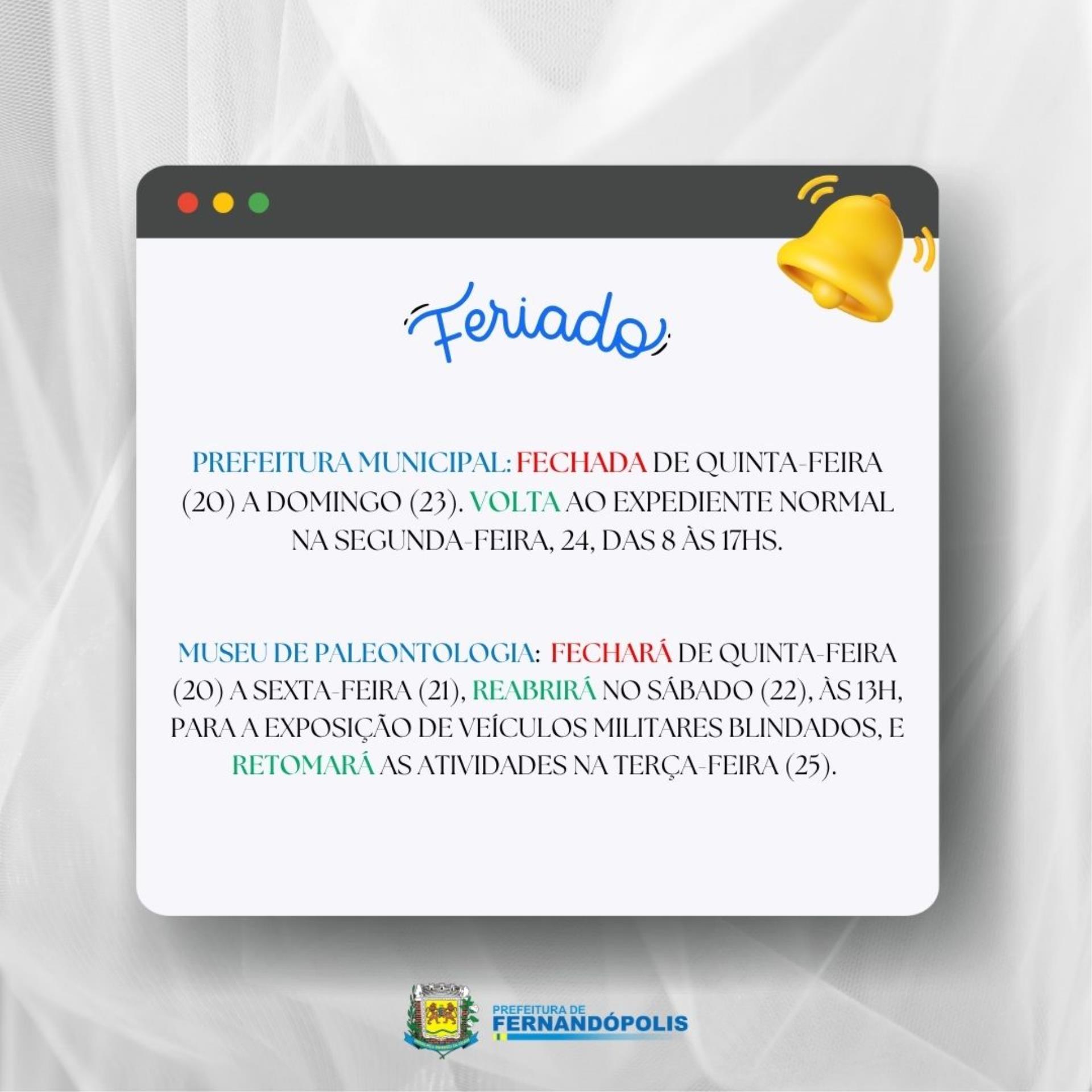 PREFEITURA DE FERNANDÓPOLIS – Fechada de quinta-feira (20) a domingo (23). Volta ao expediente normal na segunda-feira, 24, das 8 às 17hs.