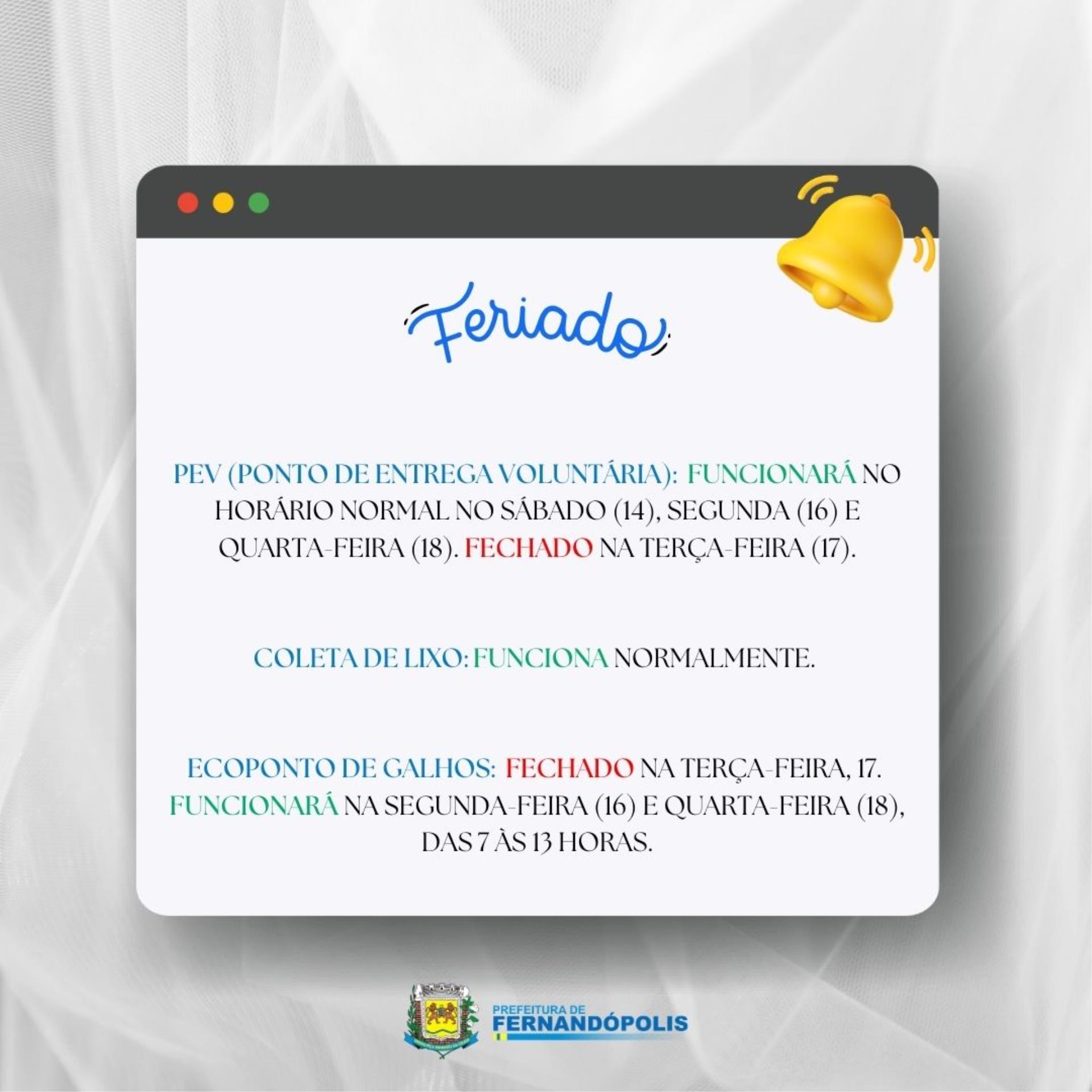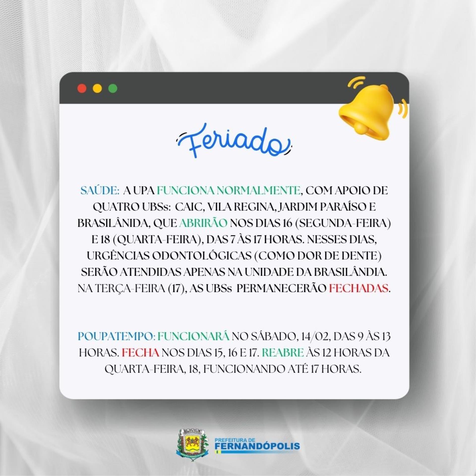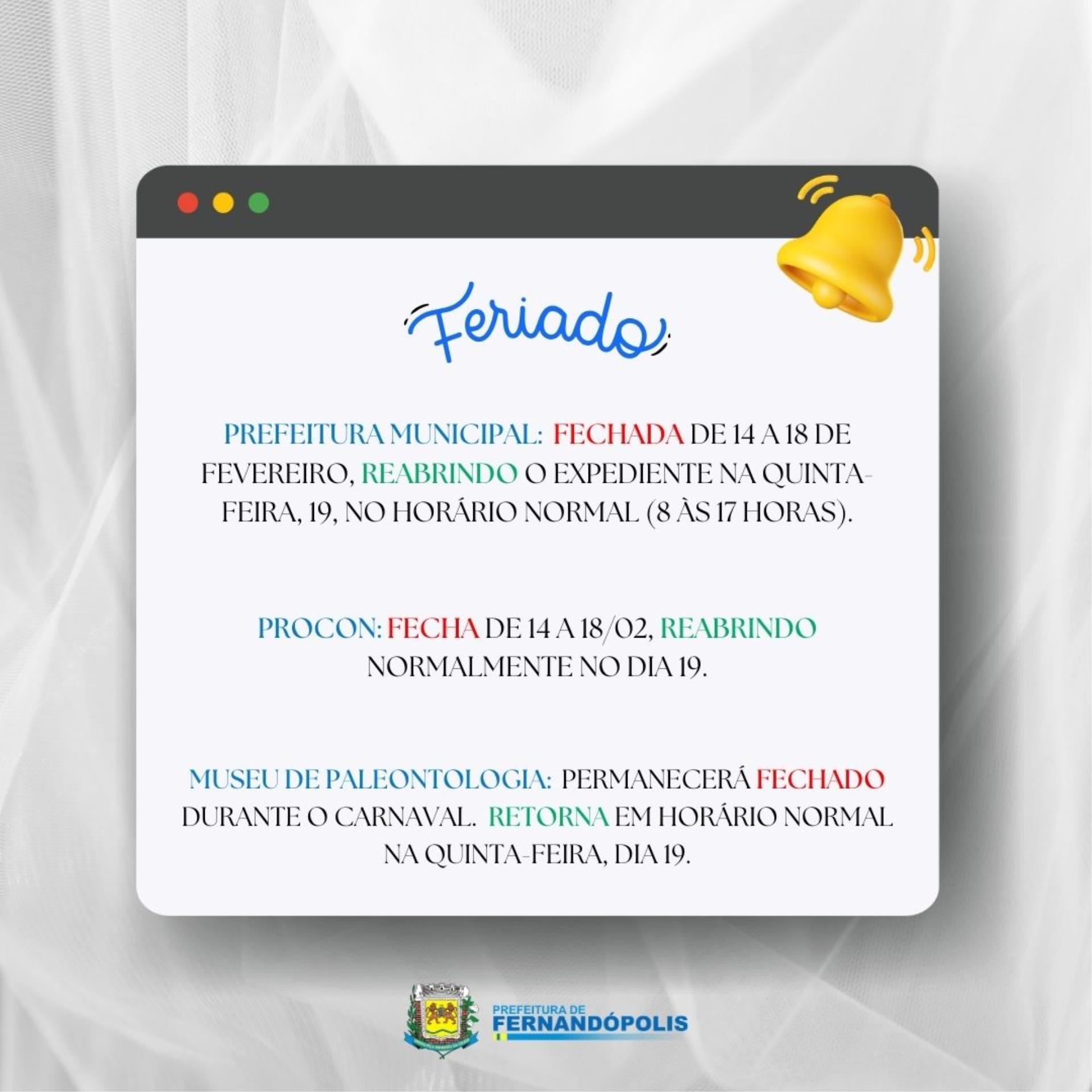 No feriado de Carnaval, a Prefeitura de Fernandópolis estará fechada de 14 a 18 de fevereiro, reabrindo o expediente na quinta, 19, no horário normal (8 às 17 horas).