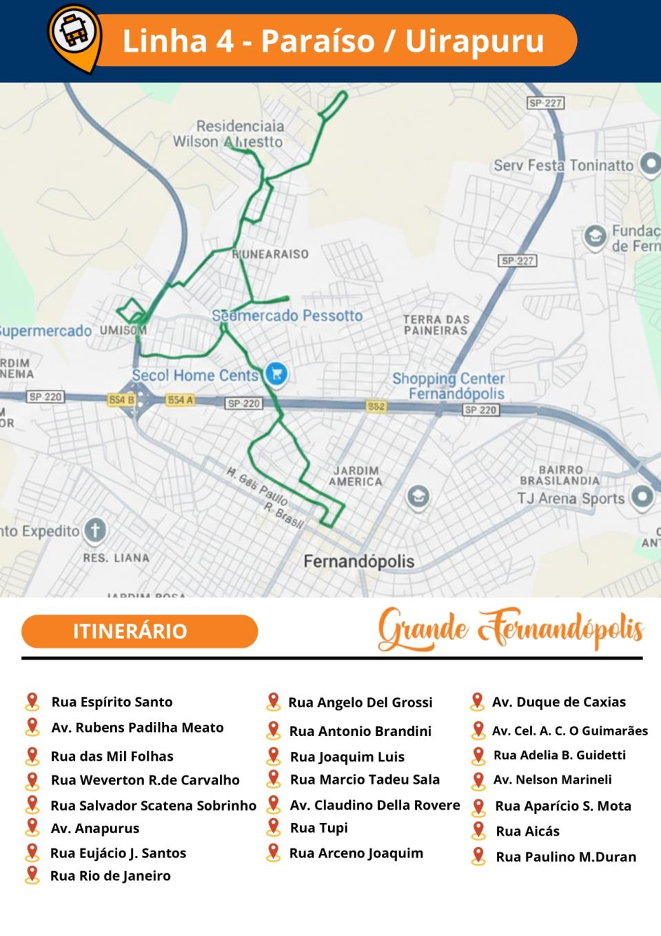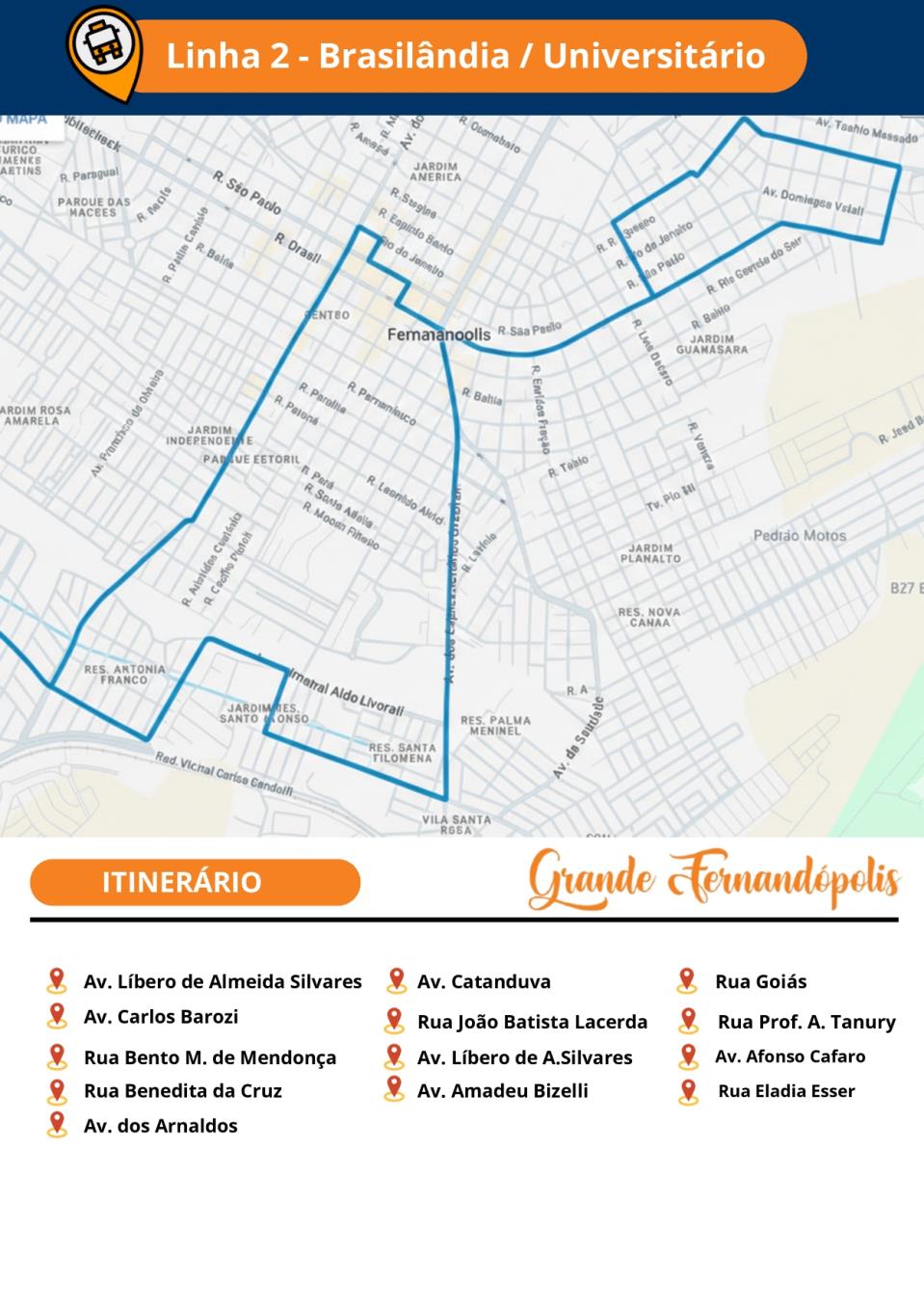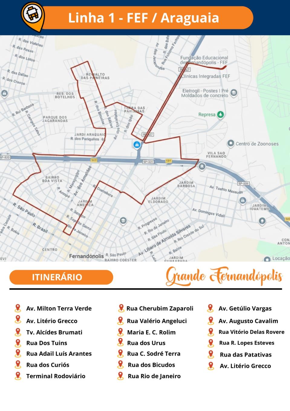 A Secretaria Municipal de Gestão de Fernandópolis, por meio do Departamento de Controle e Fiscalização dos Contratos Públicos, divulgou nesta segunda-feira (26) os novos itinerários do transporte coletivo. Confira abaixo: