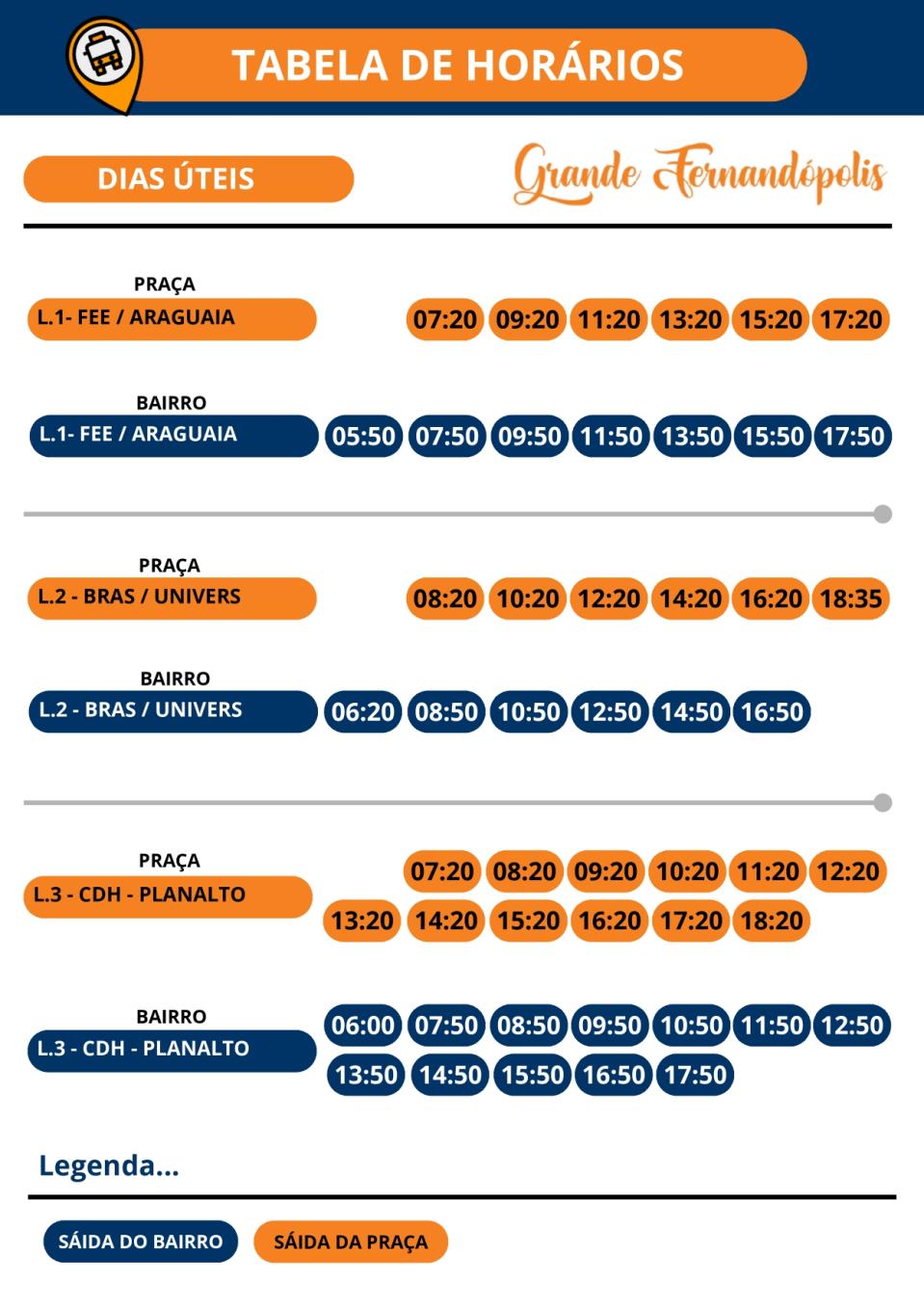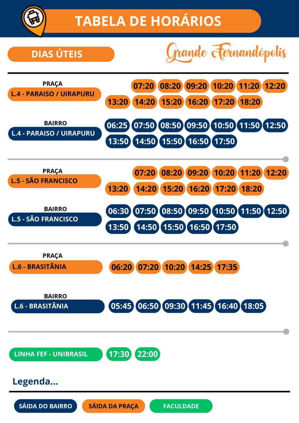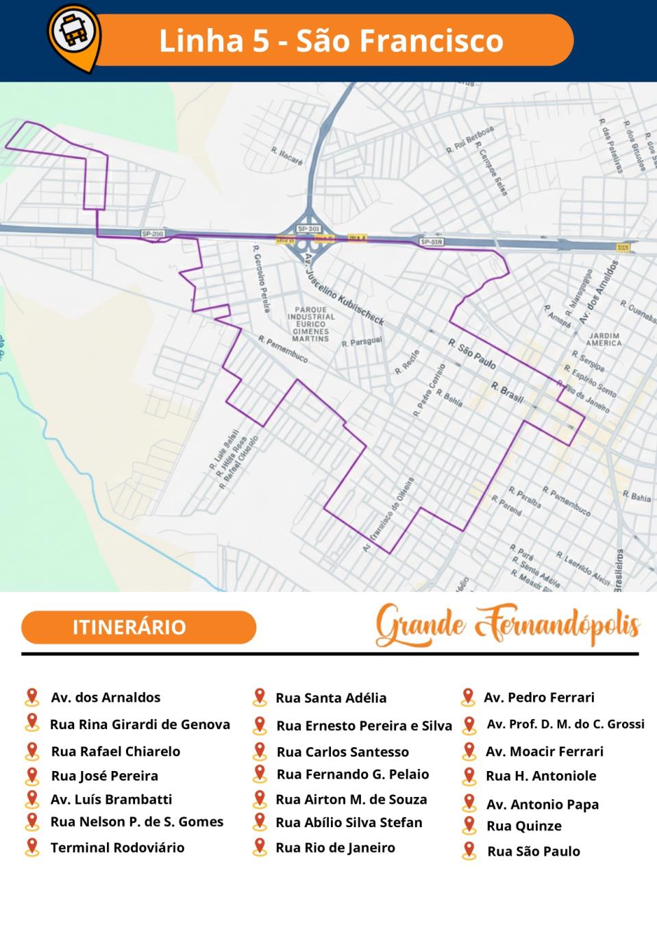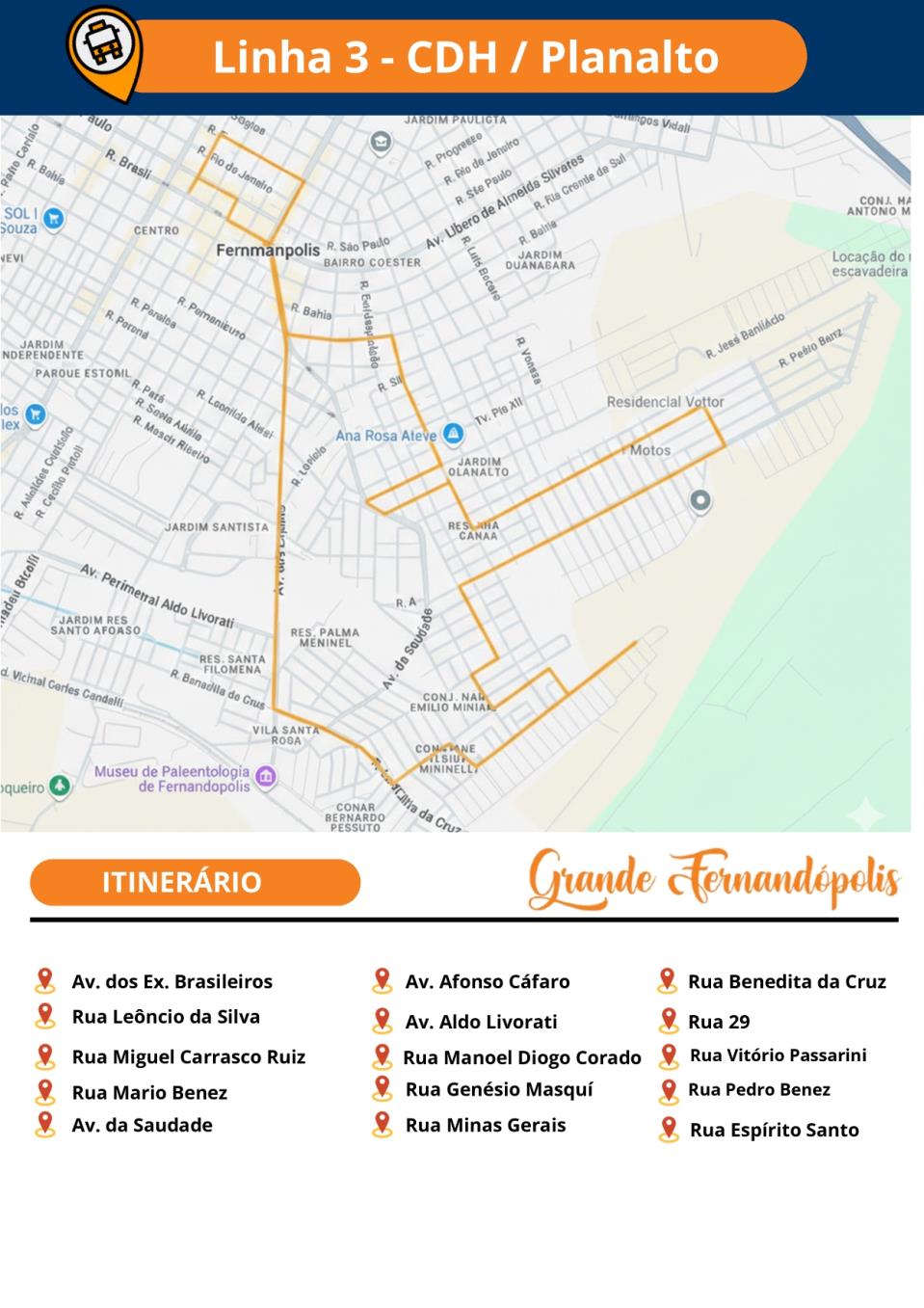 A Secretaria Municipal de Gestão de Fernandópolis, por meio do Departamento de Controle e Fiscalização dos Contratos Públicos, divulgou nesta segunda-feira (26) os novos itinerários do transporte coletivo. Confira abaixo: