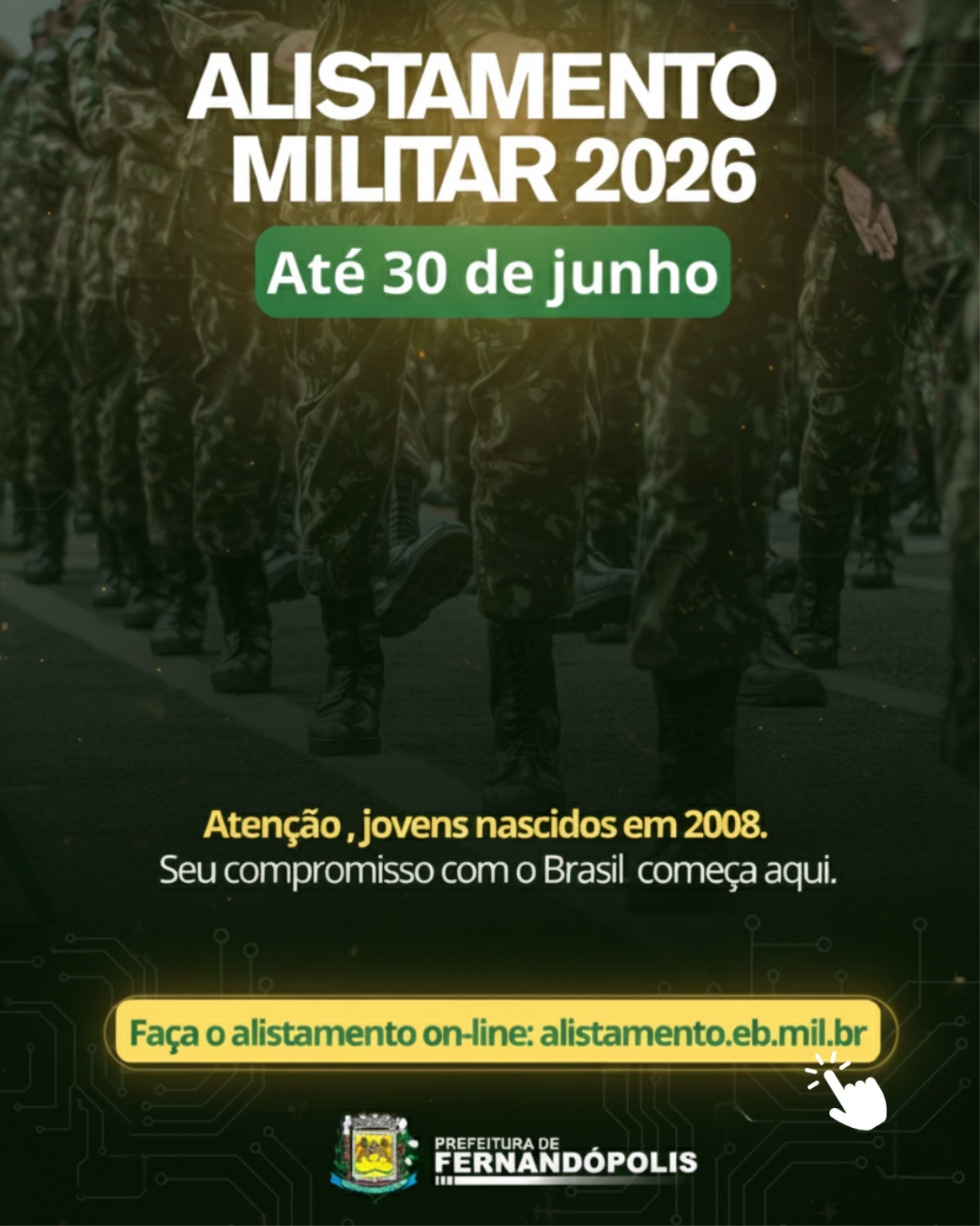 Já se encontra aberto o prazo para o Alistamento Militar Obrigatório dos jovens do sexo masculino pertencentes à classe de 2008, bem como para a regularização daqueles que não realizaram o procedimento em anos anteriores. O prazo para quem completa 18 anos em 2026 termina em 30 de junho.
