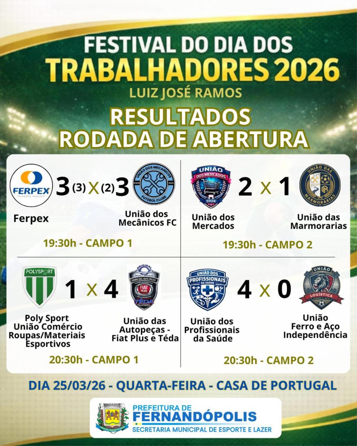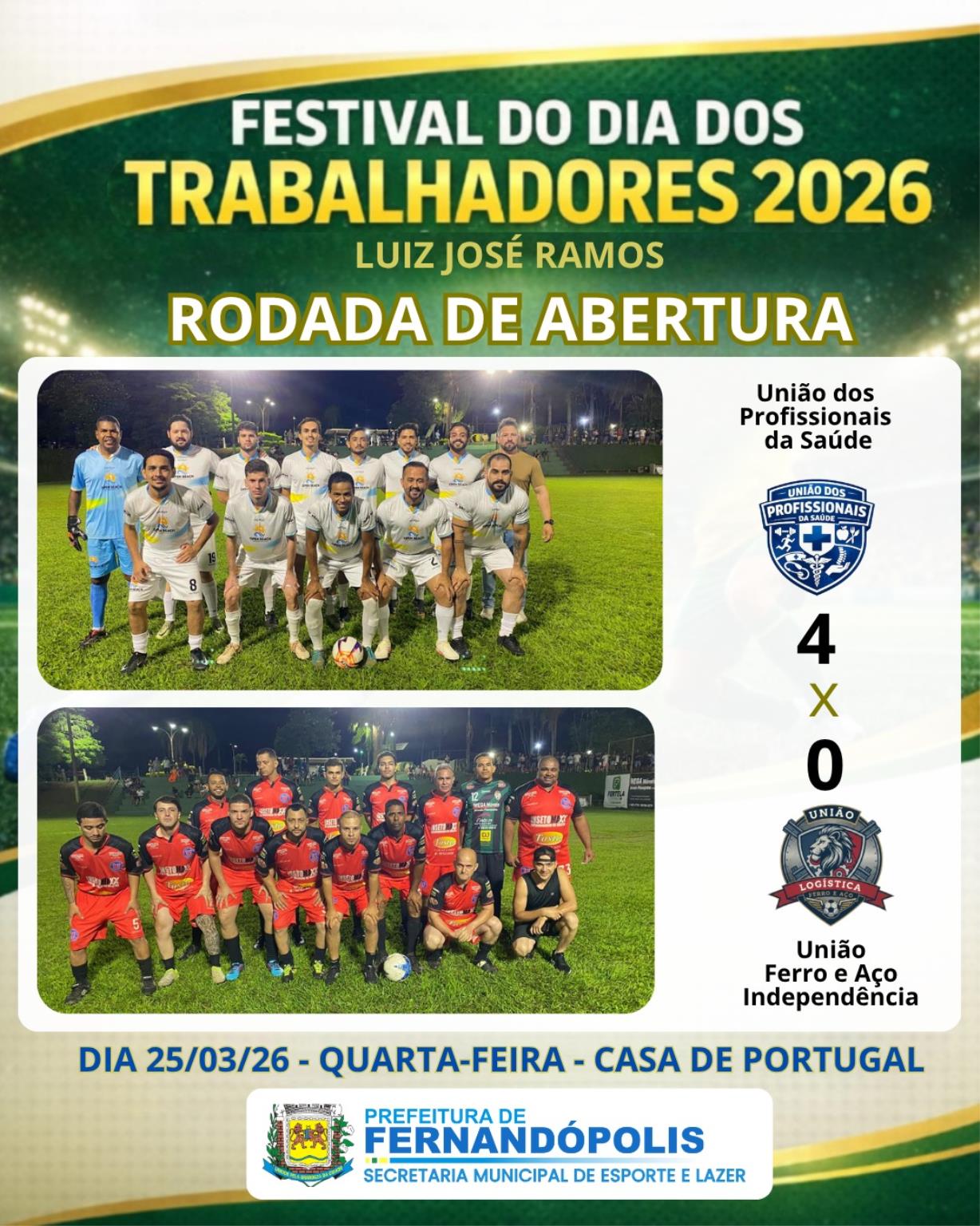 Encerrando a rodada, a União dos Profissionais da Saúde, semifinalista da última edição, conquistou uma excelente vitória por 4 a 0 sobre a forte equipe da União Ferro e Aço – Independência. Os gols foram anotados por João Dreison (2), Murilo Calori (1) e Maurício Pimenta (1), demonstrando que a equipe entra forte na briga pelo título em 2026.