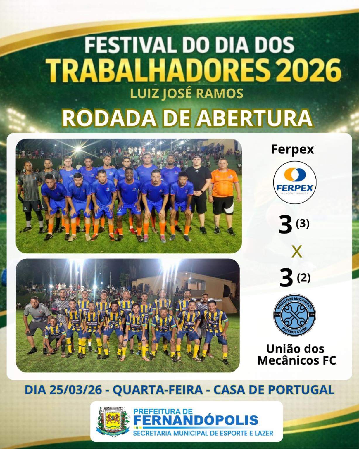No confronto mais emocionante da noite, a Ferpex protagonizou uma virada histórica. Após sair perdendo por 3 a 0 para o União dos Mecânicos FC, a equipe buscou o empate em 3 a 3 no tempo normal — com gols de Alison Dias (2) e Carlos Eduardo (1). Pelo lado dos Mecânicos, marcaram Diego da Silva (2) e Marco Antônio (1). Nos pênaltis, a Ferpex levou a melhor e garantiu a classificação.