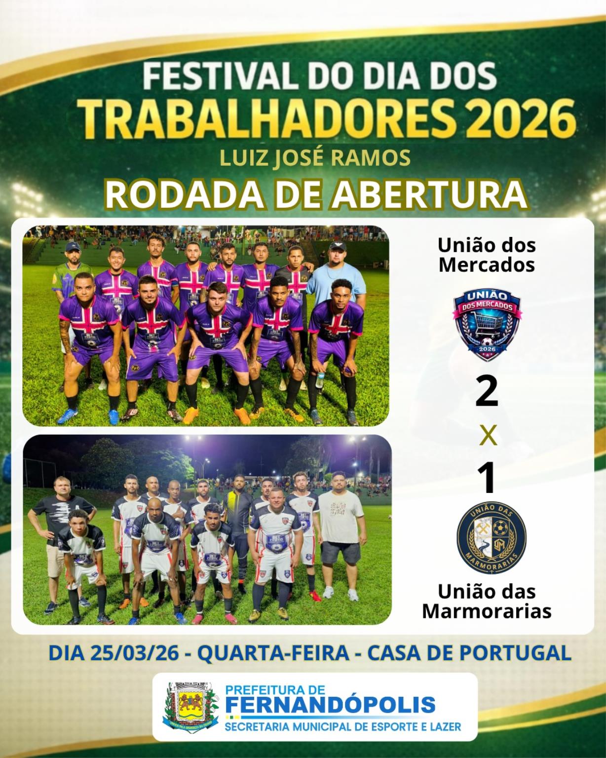 Já na partida entre União dos Mercados e União das Marmorarias, o jogo foi extremamente disputado e decidido nos detalhes. A vitória por 2 a 1 veio com gols de Diogo Brandão e Yago Jesus para o União dos Mercados, enquanto Axel Oliveira marcou para as Marmorarias.