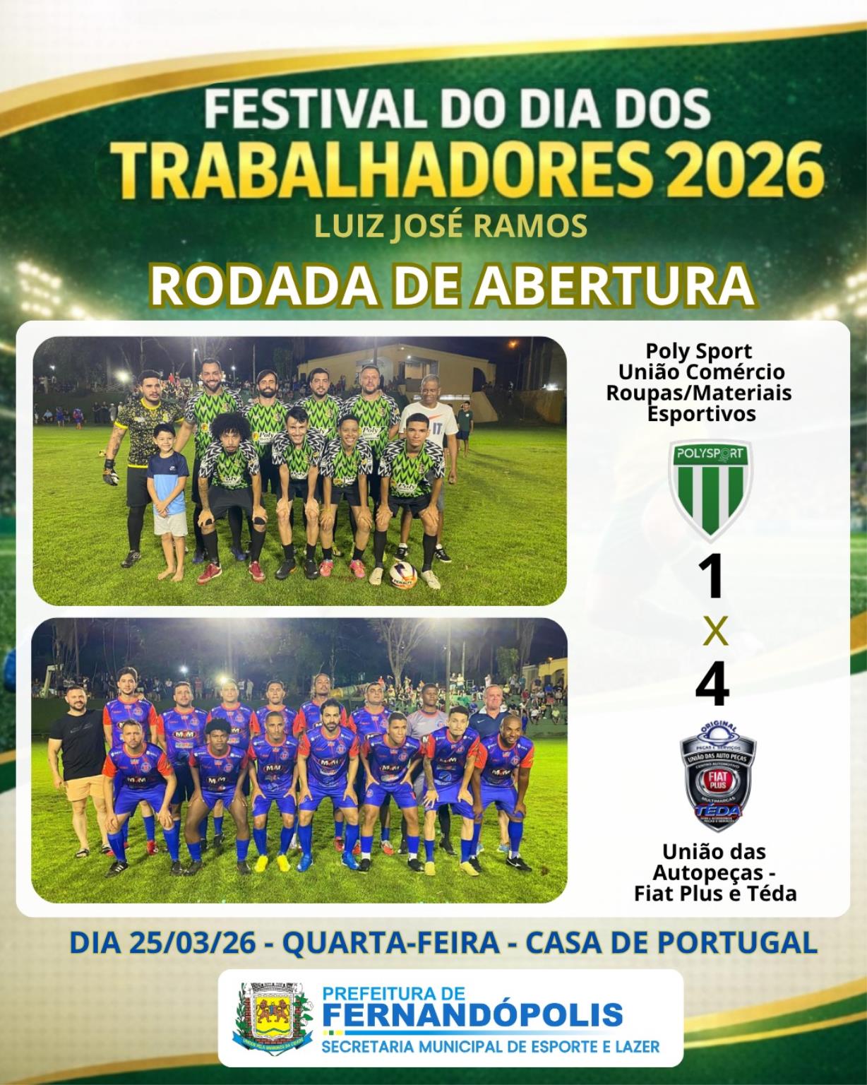 A atual campeã, União das Autopeças – Fiat Plus e Téda, mostrou sua força e superioridade ao vencer a forte equipe da Poly Sport / União do Comércio de Roupas e Materiais Esportivos por 4 a 1. Os gols foram marcados por Rafael Silva (3) e Thales Henrique (1), enquanto Eduardo Alves descontou para a Poly Sport. A atuação reforça que a equipe segue firme na defesa do título conquistado em 2025.