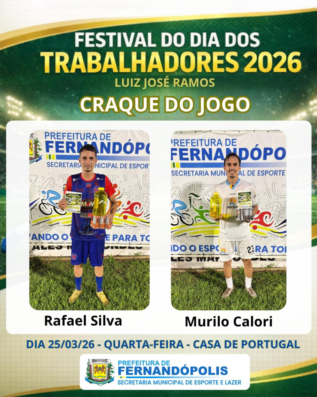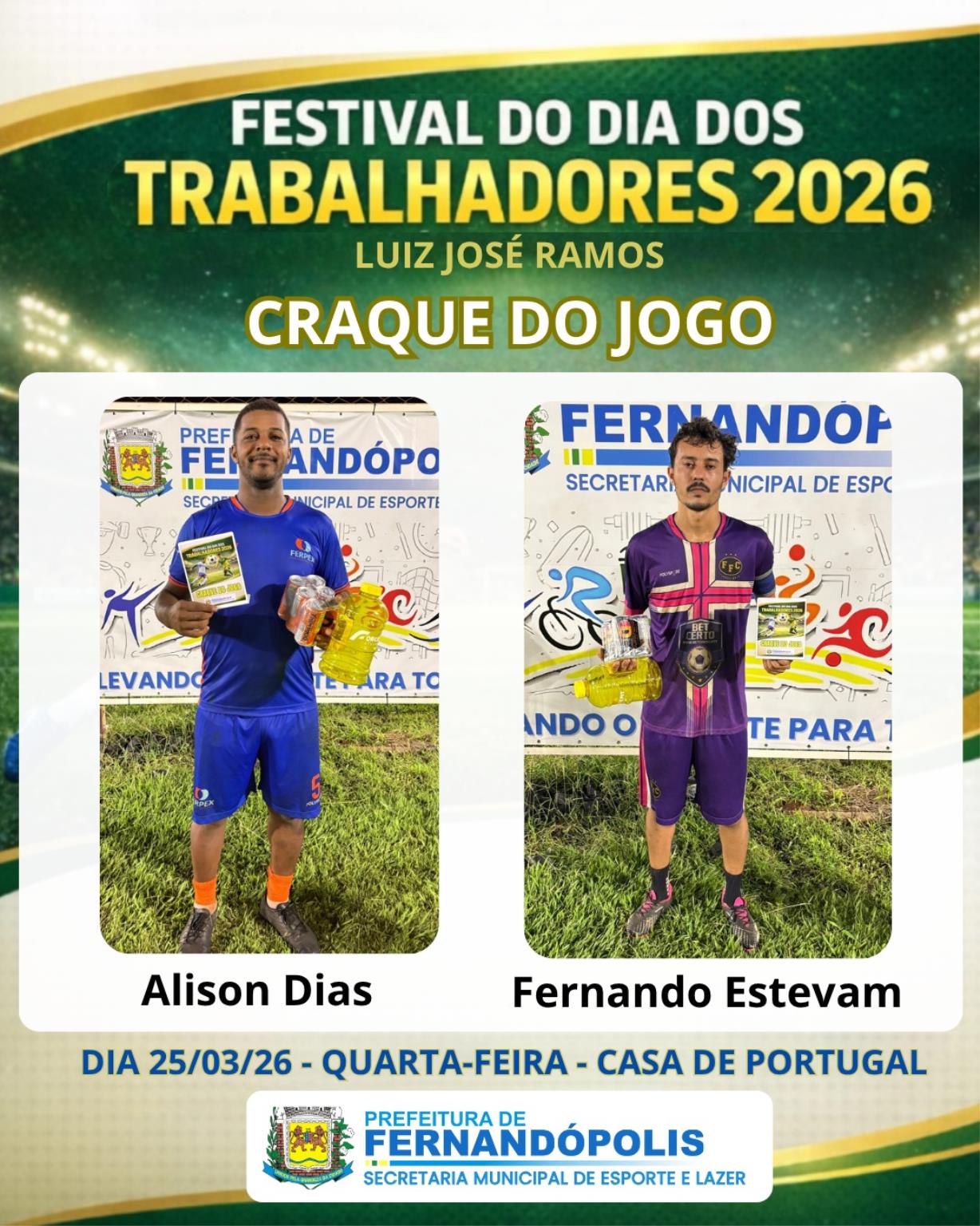 Durante a cerimônia, o prefeito destacou o compromisso da Administração Municipal com o incentivo ao esporte. “Através da Secretaria Municipal de Esportes, temos ampliado o apoio aos atletas da nossa cidade e os eventos esportivos. O Festival dos Trabalhadores é uma tradição em Fernandópolis, sempre com grande participação do público e, neste ano, com recorde no número de equipes inscritas”, afirmou.