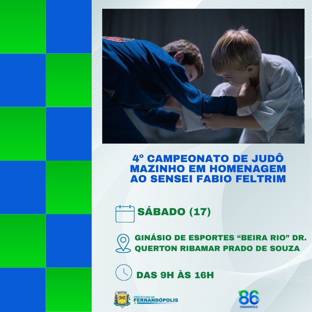 No sábado, 17, acontece o 4º Campeonato de Judô Mazinho, no Ginásio de Esportes “Querton Ribamar Prado de Souza”, com pesagem dos atletas às 7h30 e abertura às 9h. O torneio desse ano é uma homenagem ao Sensei Fábio Feltrin, e deve se encerrar às 16h.