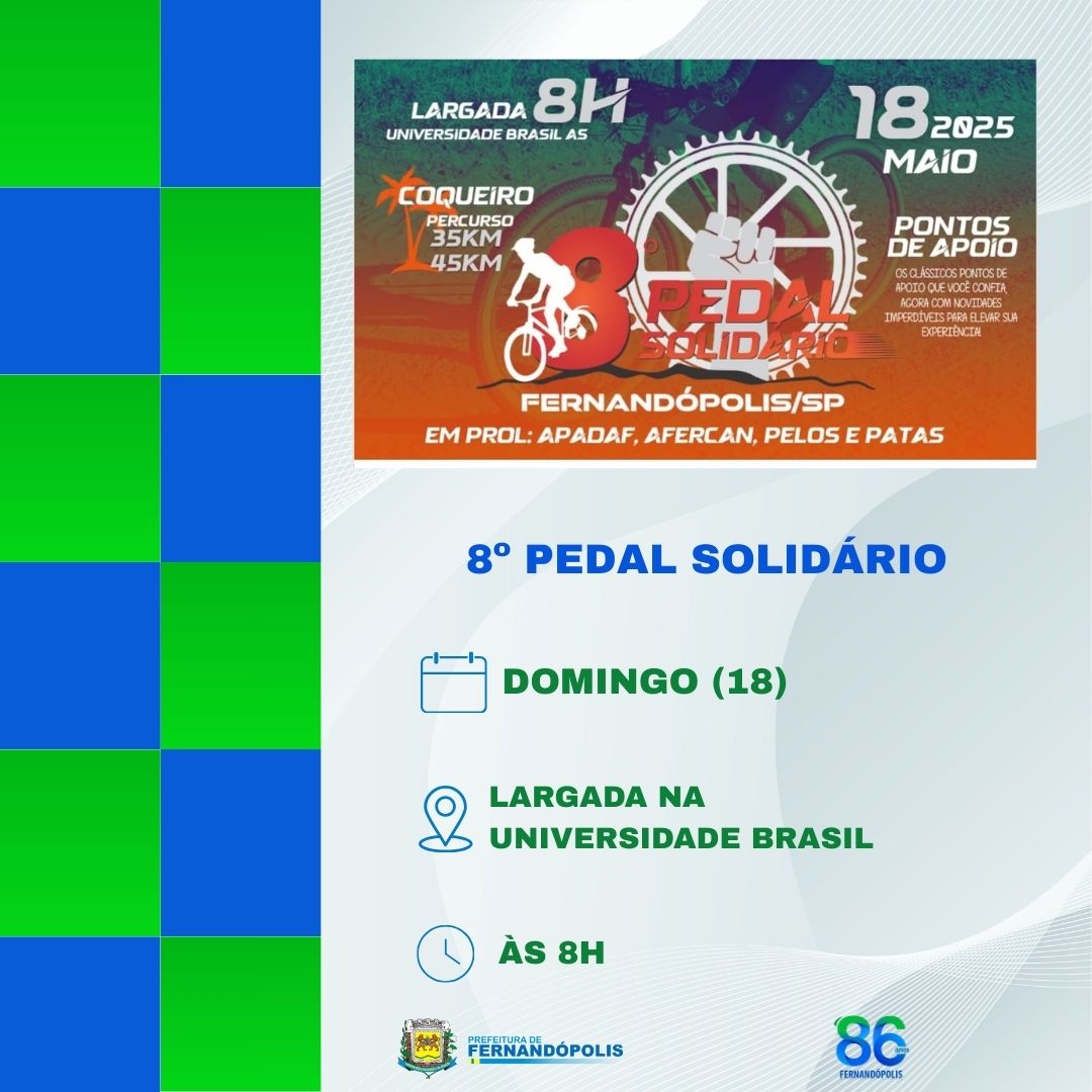 Já no domingo, 18, a agenda prevê o Pedal Solidário, que terá início às 8h, na Universidade Brasil, e tem caráter beneficente, pois a renda das inscrições será revertida para as entidades assistenciais de Fernandópolis.