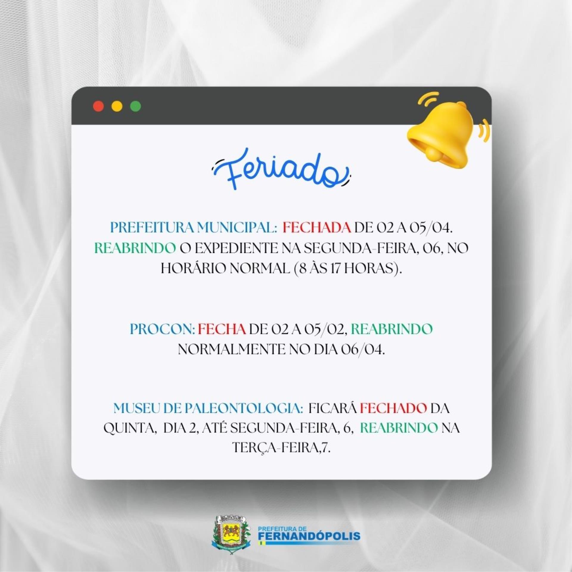 Com o feriado da Sexta-feira da Paixão nesta sexta-feira, 3 de abril, haverá alteração no atendimento de vários serviços do município de Fernandópolis.