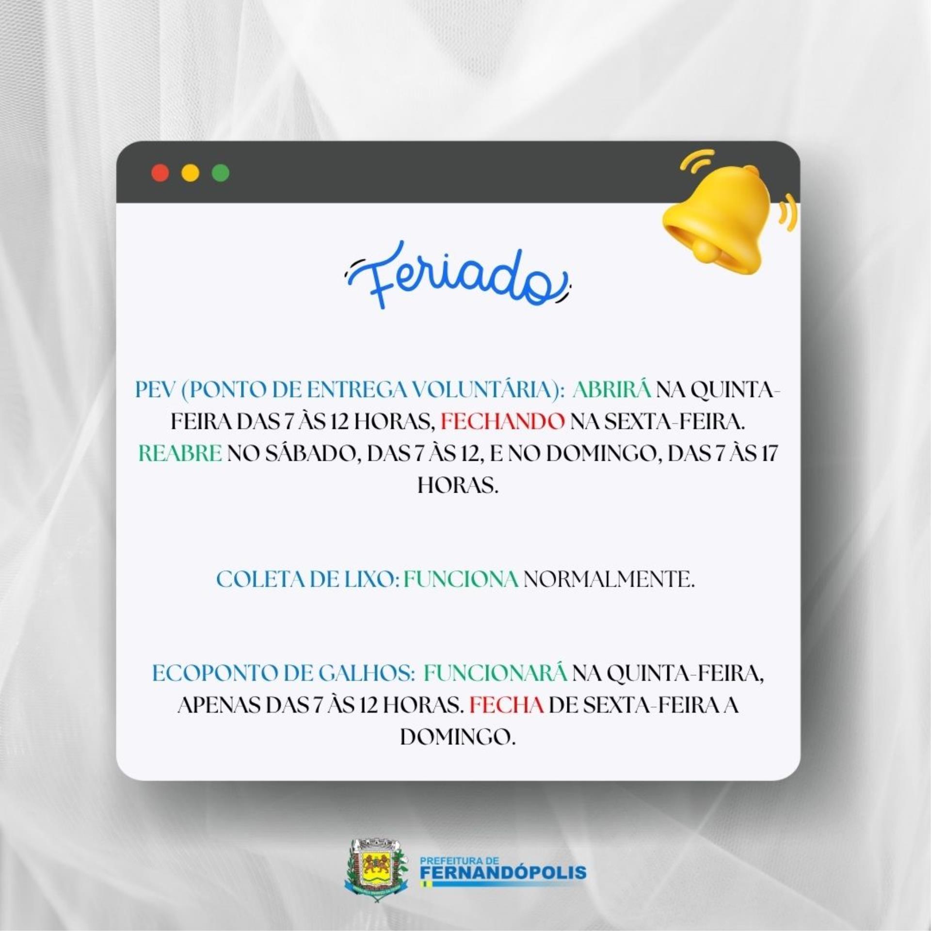 A Coleta de lixo funcionará normalmente durante toda a semana. O Ecoponto de galhos funcionará na quinta-feira, apenas das 7 às 12 horas. Fecha de sexta-feira a domingo. Já o PEV (Ponto de Entrega Voluntária) abrirá na quinta das 7 às 12 horas, fechando na sexta-feira. Reabre no sábado, das 7 às 12, e no domingo, das 7 às 17 horas.