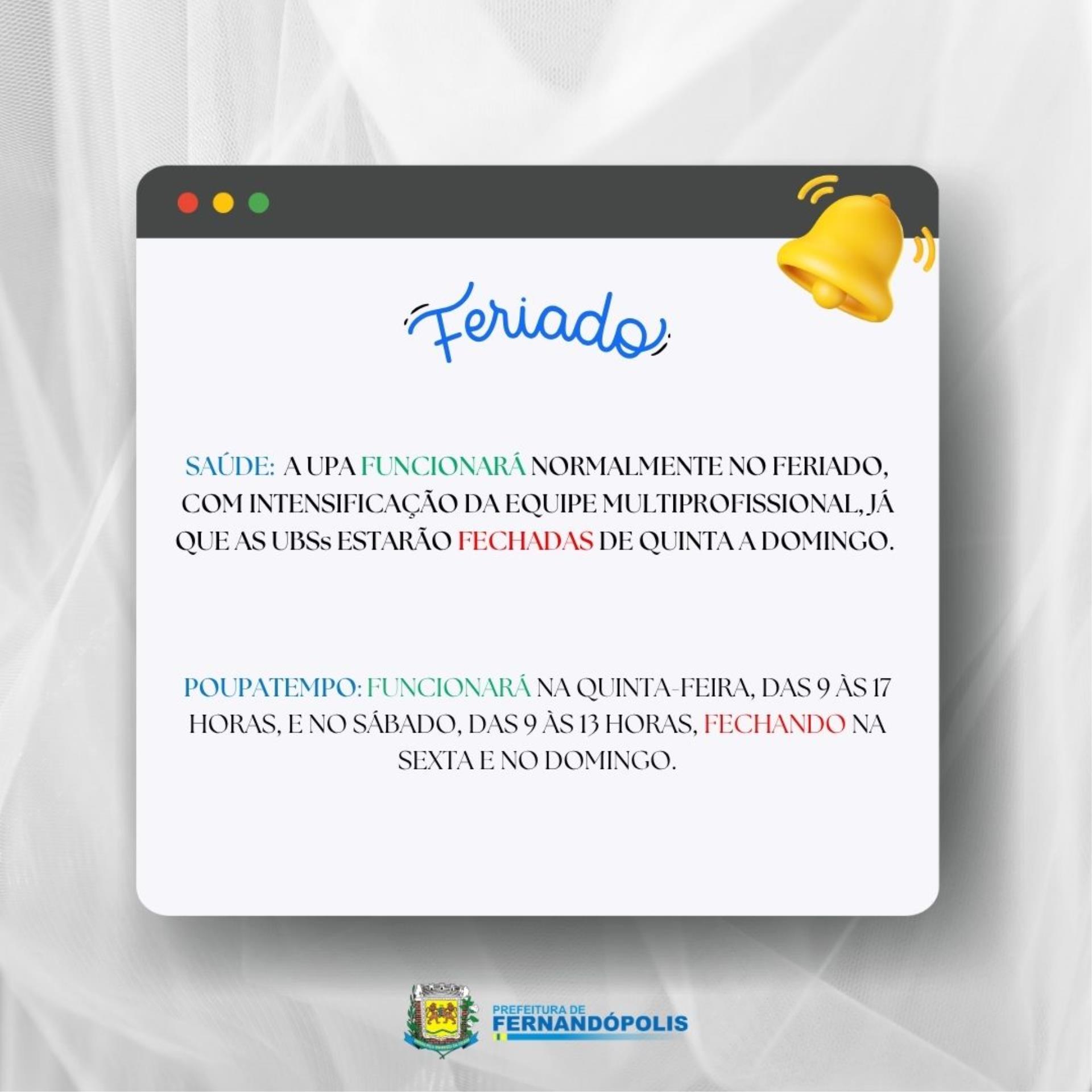 Na Saúde, a UPA funcionará normalmente no feriado, com intensificação da equipe multiprofissional, já que as UBSs estarão fechadas de quinta a domingo.